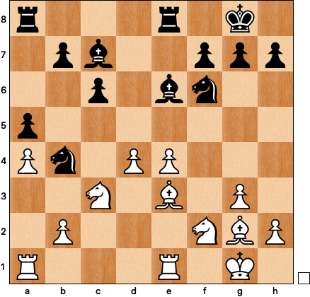 That left me with a move that seems obvious in retrospect, 17 … a5!, fixing the queenside pawns before white can take control. White can play 18 Nc5, but here 18 … Bc8 is safe enough, and 18 … Na6!? is an interesting play for the initiative. My opponent blinked and played passively, and after 18 Nf2 Be6 19 e4 Na6 20 Be3 Nb4 and black is very comfortable: