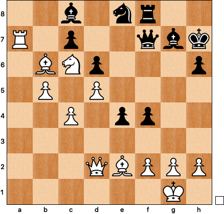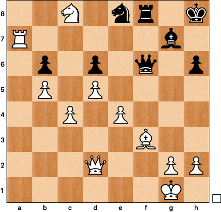 White is up three pawns, but I was still not enjoying my position. Black’s pieces are coordinated, threatening trickery on the dark squares. Mine are not: what’s rook doing now on a7? And the stranded Nc8? The computer says that there’s no need to rush, just Kh1 and h3 is fine, but it’s inhuman to sway precariously in the wind indefintely, so I settled on a plan of recoordinating my pieces and reestablishing balance.