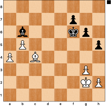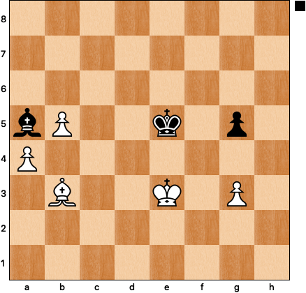Should black be playing for counterplay with his extra pawn on the kingside? No, he should not. The only path to the draw is to remove the kingside pawns as light-squared targets, starting with 69 … g5! After 70 Kf3 I should have kept to the plan with 70 … h4!, but erred with 70 … Ke5? White’s 71 Bxf7? returned the favor — 71 h4!, fixing the h-pawn on a light square, would have won — and I didn’t need a third chance to find the right defensive idea: 71 … h4! 72 Kg4 hxg3 73 hxg3 Kf6 74 Bb3 Ba5 75 Kf3 Ke5 76 Ke3: