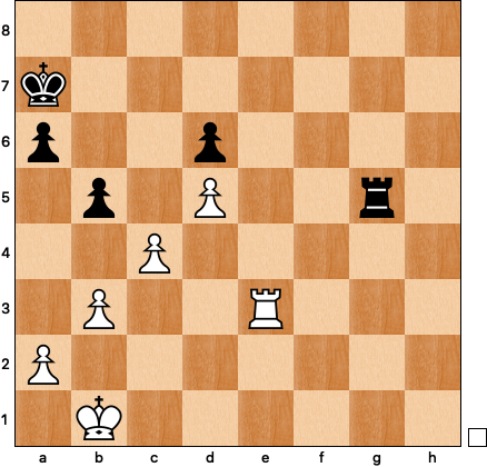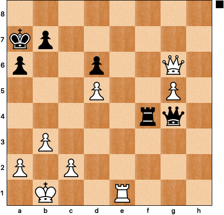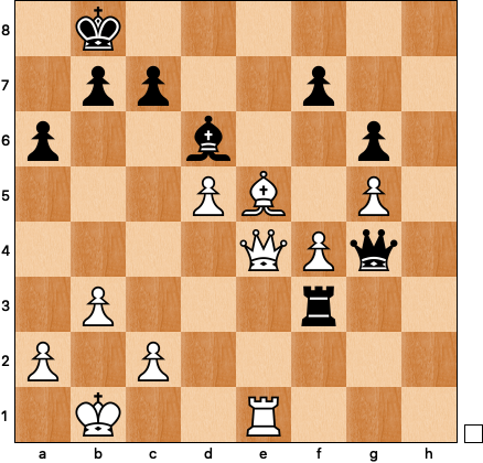 White’s position feels like it should be winning: up two pawns, the d6-pawn under attack, the black pieces oddly placed (doing what exactly?) on the fourth rank. Despite all this black’s position is not hopeless: 34 … Qg3! 35 Qe6 (the white rook can’t leave the back rank because of Qg1+ and Qd4+) 35 … Rg4 36 Qe3+ Qxe3 37 Rxe3 Rxg5 38 c4 b5: