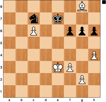 The theory of two weaknesses is all too relevant this time. On the one hand, white is going to soften up the g-pawn with h4-h5 and then invade on the light squares: Ke3-e4-f5-g6. On the other hand, black has to devote some of his few remaining resources to the far advanced c-pawn. Fortunately I noticed a small but critical detail that my opponent had missed5: 42 … Kd6 43 h5 Kxc6! It feels strange to allow a new passed pawn to appear on g6, but the knight can be good at holding a fortress if it’s on the right track — and it just so happens that it is. After 44 hxg6 Ne8 45 Ke4 Ng7 there is no way in for the white king, and the g-pawn is stuck in its tracks: