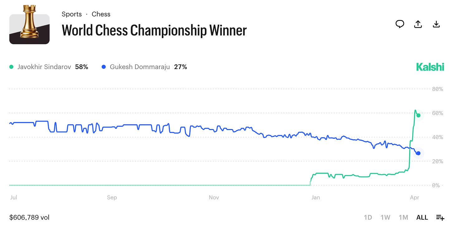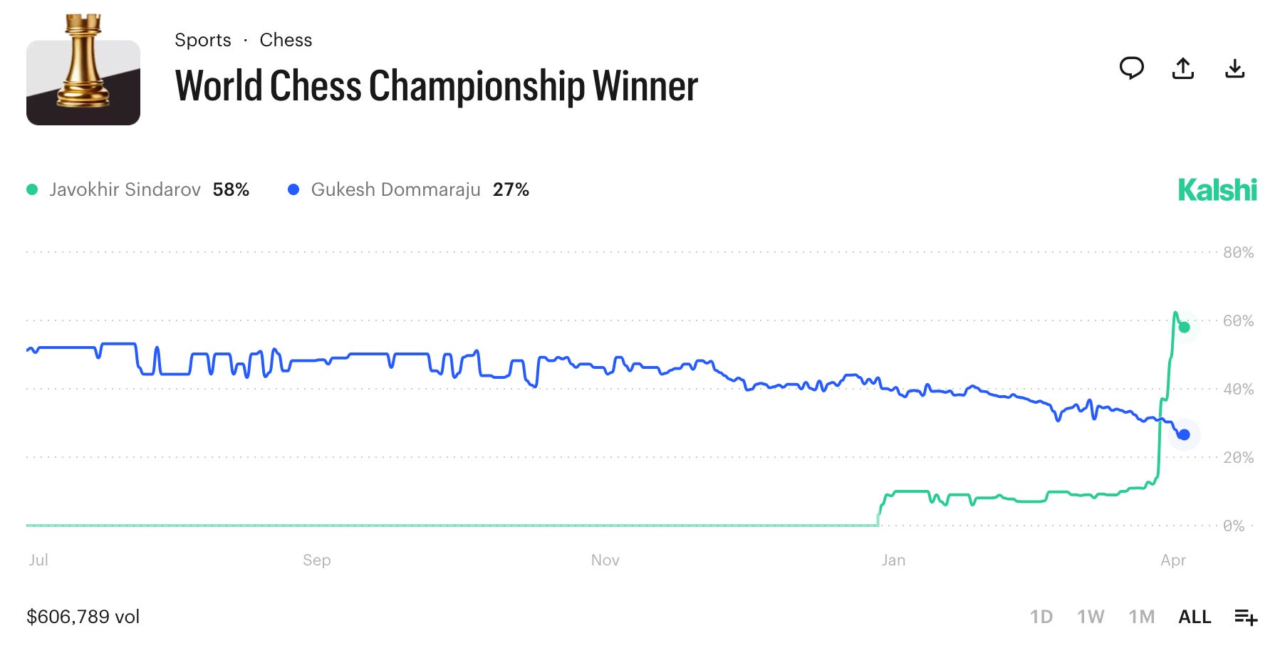 The prediction markets are bullish about the Sindarov’s chances in the Candidates and the World Championship match to come:
