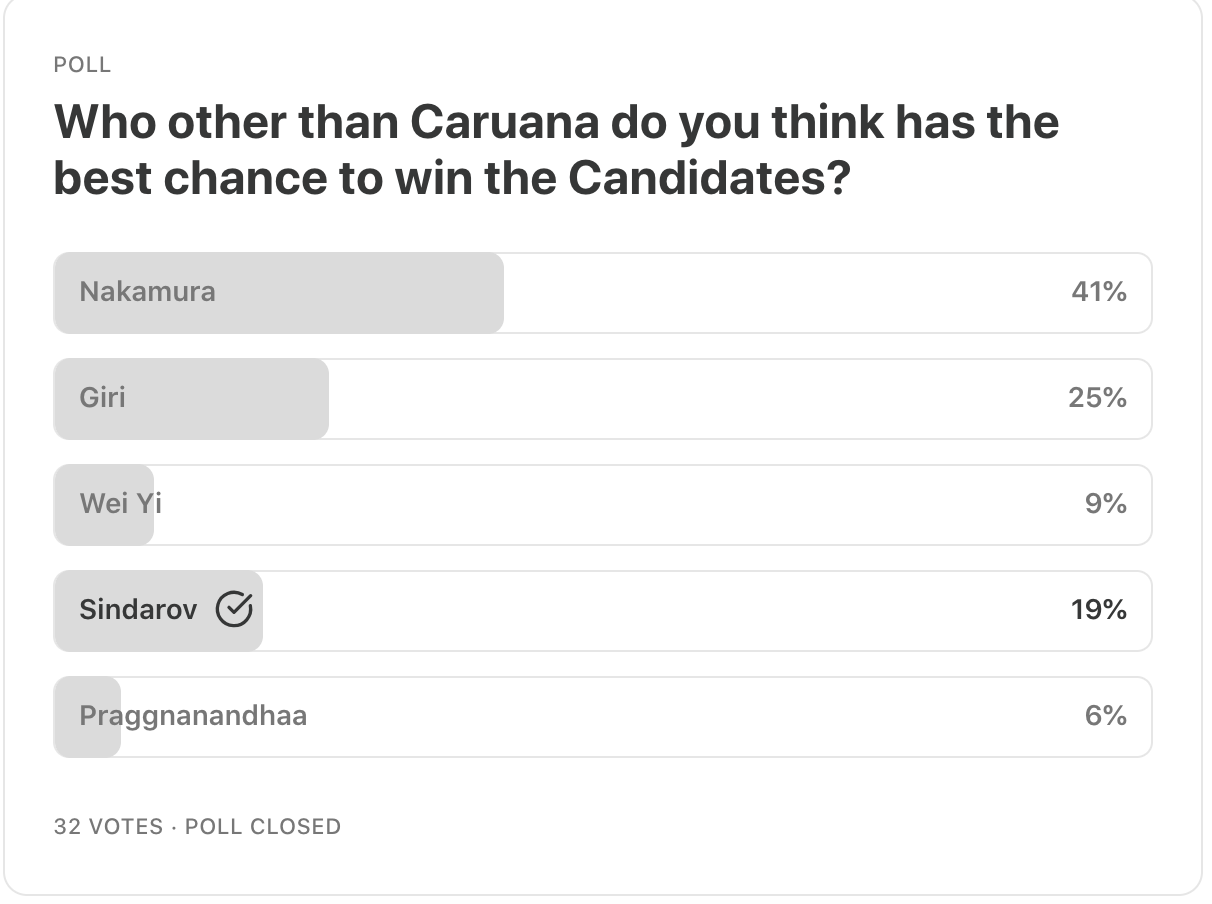 Nothing about Gukesh’s recent performances have inspired confidence, but I personally find it crazy that Sindarov, who hasn’t even won the Candidates yet, is considered twice as likely to be world champ at this time next year. That’s 2024 Ding Liren territory, and even Ding was able to hold his own for most of the match. I also wouldn’t count out Caruana, who is capable of winning a bunch of games in a row and will have white against Sindarov in their critical round eleven game. That’s a must win, and then he’ll have to pick up another point or two along the way — difficult, but not impossible. That said, it’s Sindarov’s tournament to lose, and there’s no reason to think that he’s going to turn into a pumpkin.